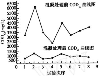 PAC絮凝處理前后CODcr值的變化如圖1所示,據(jù)圖1可知,絮凝反應(yīng)器的進(jìn)水CODcr濃度在2392~6200mg/L之間,經(jīng)過絮凝處理后,廢水的CODcr濃度降低到517~1128mg/L,去除率達(dá)到73.4%~85.2%。說明在系統(tǒng)穩(wěn)定運(yùn)行階段,CODcr處理效率較高,即使偶爾廢水的進(jìn)水CODcr濃度較高,但只要保證或者使絮凝處理反應(yīng)處在一個(gè)最優(yōu)條件下運(yùn)行,仍可使絮凝處理的CODcr保持較高的去除效率,使絮凝處理后的CODcr值較低。