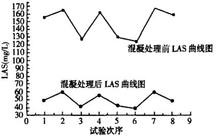 絮凝處理后,LAS的濃度得到有效的降低,降低了后續(xù)工藝的處理負(fù)荷,解決了高濃度LAS阻礙生物降解的問題。