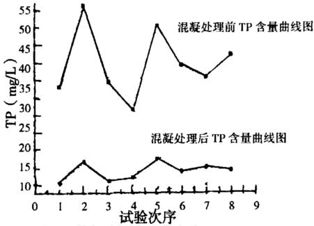 PAC 絮凝反應(yīng)器的進(jìn)水TP的含量在2614~5611mg/L之間,經(jīng)過絮凝反應(yīng)處理后,TP的含量降低到513~1211mg/L之間,去除率達(dá)到73.5%~84%。這說明絮凝處理對TP的處理效果較好。